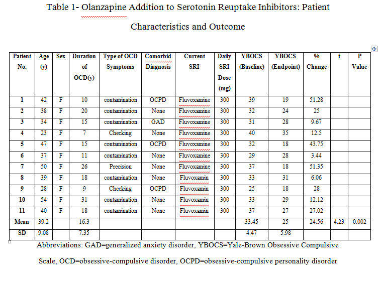 Conclusion: This study shows that treatment-refractory OCD Patients may benefit from addition of olanzapine to ongoing SRI therapy.