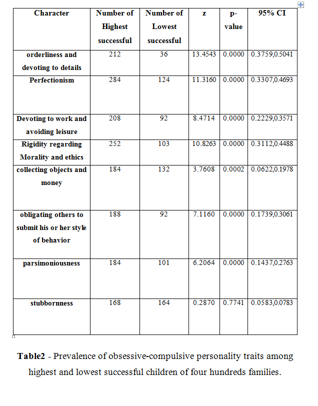 Four hundreds families, who have been chosen randomly among usual clientele to a general medical clinic, has been asked regarding the existence of obsessive-compulsive traits, assumed from the diagnostic criteria table in the Diagnostic and Statistical Manual of Mental Disorders,5th edition, in their highest and lowest successful children. Success was defined broadly as the “greatest obtainable achievement” in social, personal, educational and occupational aspects of life, according to ‘their own standards and perspectives’. Mothers, fathers or both of them were asked by a self-reply questionnaire, which included the complete obsessive-compulsive traits, specified with separate checkmark columns for highest and lowest successful children. Besides it had been stressed for responders that such definition of “success” could only be justifiable, when there was no external and inevitable factor responsible for its achievement or frustration. The families with less than two children or children less than 14 years old were excluded from the study. If there were more than two children above 14 years old, the parents were asked to choose among all of them the highest successful and the lowest successful ones by their own decision, with respect to their personal socio-cultural values.